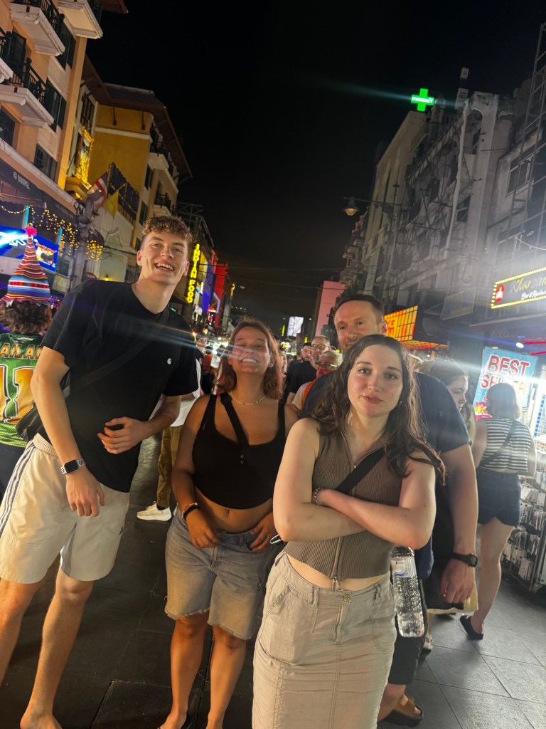 No trip to Bangkok is complete without a visit to the iconic Khao San Road—a backpacker’s rite of passage. A rooftop mingling at my hostel turned into an impromptu adventure with two new friends. We wandered through the neon-lit chaos, passing scorpion and crocodile skewers, enthusiastic bouncers, blaring music, and vendors peddling roses and bracelets. I met up with a German girl (who’d messaged me on Hostelworld) and her Spanish friend, and together we celebrated young solo travel over cold beers. By 2 AM, I was ready to head back for a peaceful night’s sleep. I didn’t feel the need to return—but I’m glad I experienced it once.