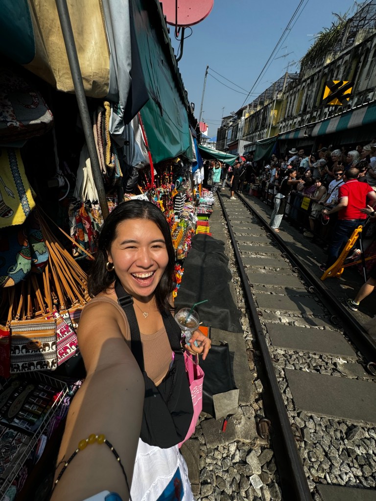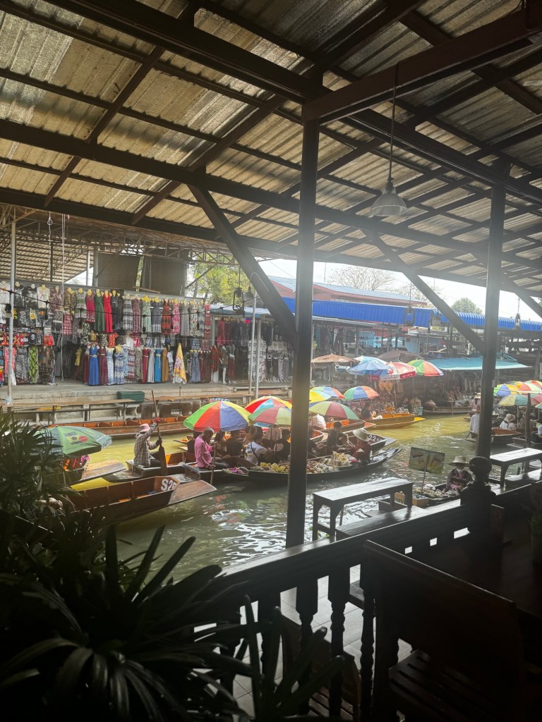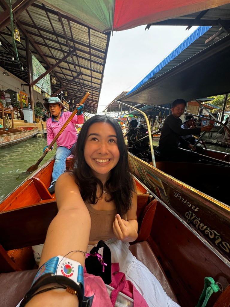 Despite being labeled “touristy” by some, the floating market was one of my favorite Bangkok experiences. Drifting along the canals, I watched Thai aunties whip up fresh Pad Thai and uncles scoop coconut rice topped with crushed peanuts. Colorful umbrellas shaded the stalls, and the air was rich with the aroma of grilled bananas and sizzling meats. Though slightly hungover from the night before, I relished the vibrant atmosphere, the kindness of the vendors, and the joy of sampling delicious street food. Sitting in the boat with the sun warming my skin and my heart full of gratitude—these are the moments I travel for.