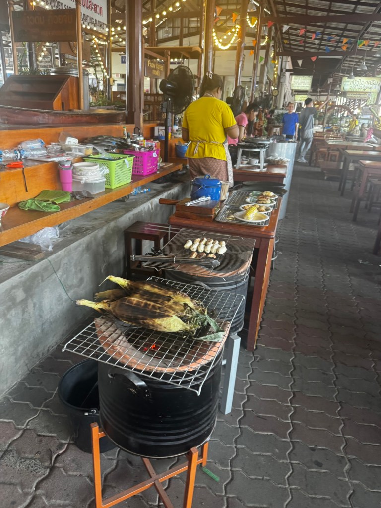 Afterward, I explored the surrounding market area and indulged in stir-fried morning glory and grilled pork, choosing a stall solely based on the irresistible smell wafting through the air. A refreshing mango smoothie in hand, I headed to my next stop.