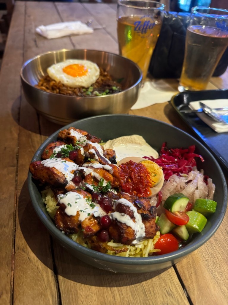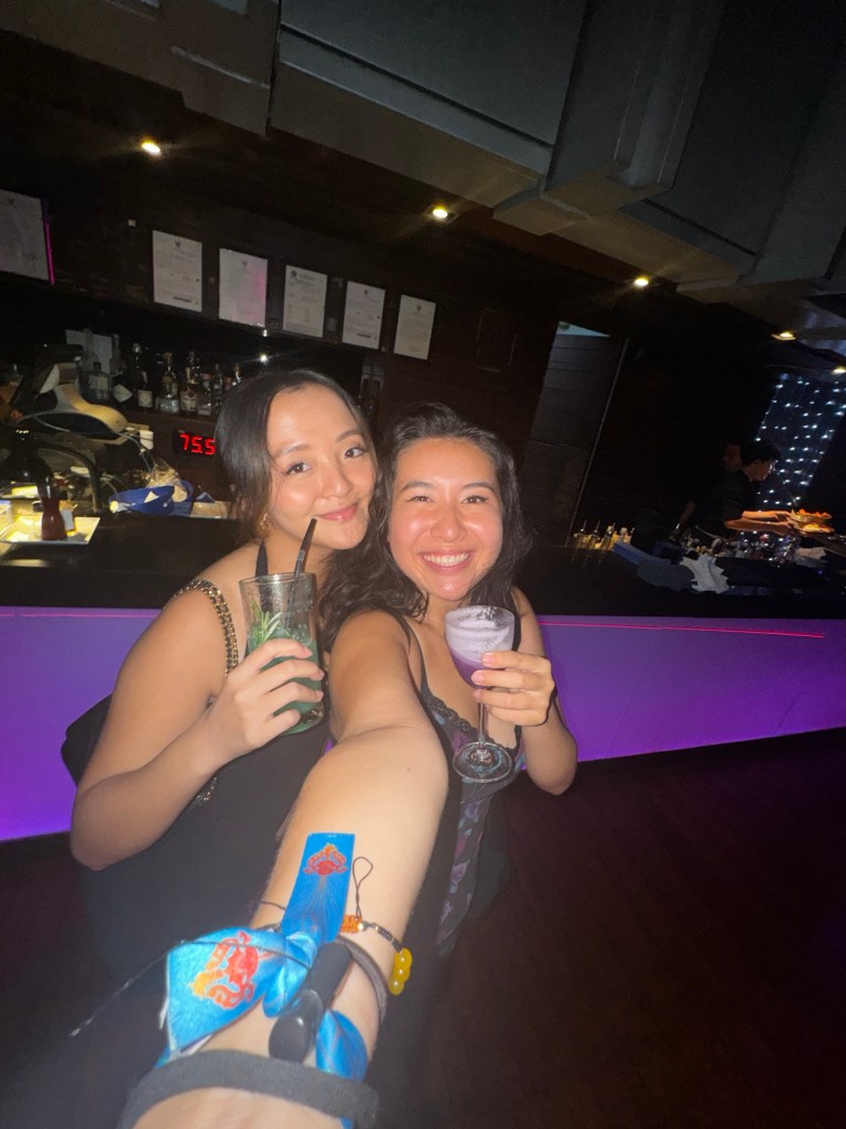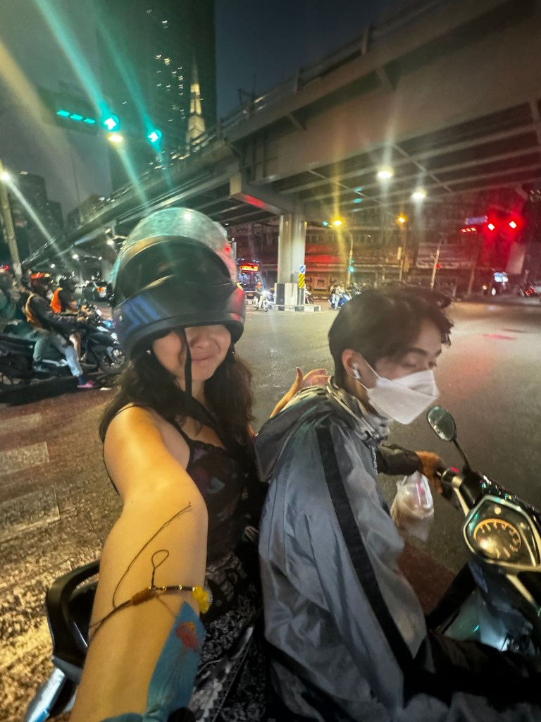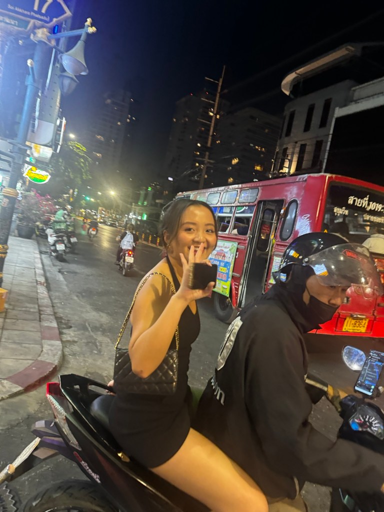 On my last night in Bangkok, I met up with Kate, an old college friend I hadn’t seen in years. Wanting a break from Thai food, she suggested we head to The Commons Thonglor, a vibrant food space with a variety of options. Kate was craving Korean, so she ordered black bean noodles topped with a fried egg, while I opted for a flavorful harissa chicken bowl from her favorite Mediterranean spot. We sipped on ciders as we caught up on the last four to five years, swapping stories and reflecting on how much life had changed. After dinner, we hopped on a motorbike to a rooftop bar (insert rooftop bar name), where we clinked glasses over fancy drinks, gazing out at the sprawling Bangkok skyline. The night was filled with laughter, future travel dreams, and the warmth of rekindled friendship.